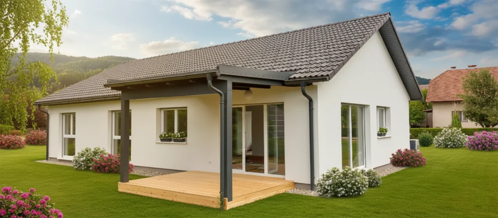 Tipska pritlična montažna hiša za vse, ki ne marajo stopnic. Bivalni prostori v izmeri ca. 113 m2, nudijo štiričlanski družini prijetno in udobno bivanje. Steklene površine, ki v notranjost prepuščajo sončne žarke, popestrijo sam izgled objekta. Velika pokrita terasa pa nudi zaščito ob druženju zunaj, tako ob sončnih, kot deževnih dnevih.